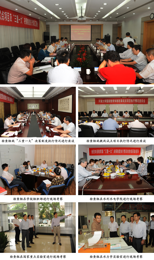 检查组就教改试点项目和“三重一大”决策制度执行情况分别召开了有干部、教师代表和党外人士代表参加的座谈会,审阅了相关资料,并现场考察了组织部、水利水电学院、国家重点实验室和水力学实验室。