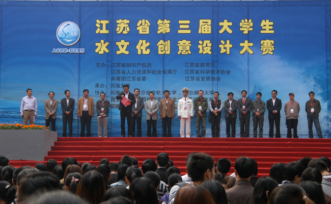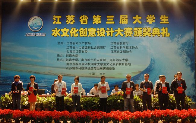 10月21日,江苏省第三届大学生水文化创意设计大赛在河海大学举行。江苏省发明协会会长俞敬忠、江苏省科学技术协会副主席吴国彬、团省委副厅级干部姜东、江苏省知识产权局副局长支苏平、江苏省发明协会副会长杨学锦、省教育厅科技与产业处处长王晓天和河海大学党委副书记王济干出席颁奖典礼。典礼由我校教务处处长阮怀宁主持。