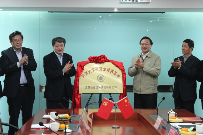 11月12日,河海大学与江苏弘业国际集团有限公司共建研究生培养基地签约暨揭牌仪式在南京举行,河海大学校长、研究生院院长王乘和江苏弘业国际集团董事长周勇共同为研究生培养基地揭牌。