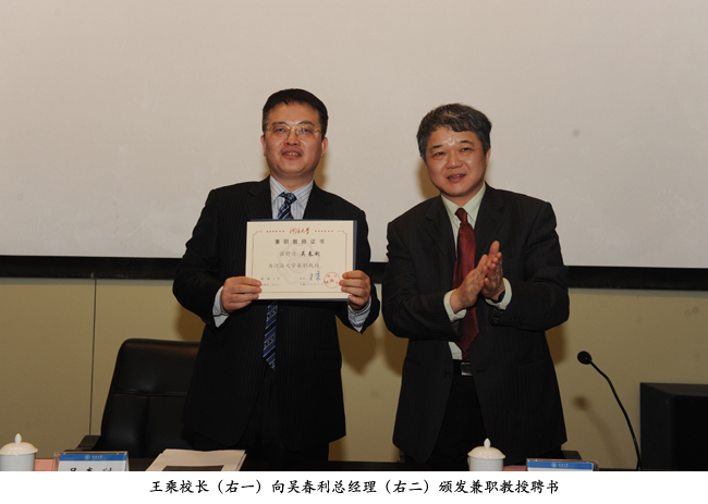 吴春利兼职教授授聘仪式暨学术报告会同日举行,王乘校长向吴春利总经理颁发了聘书,学生代表为吴春利总经理佩戴校徽。授聘仪式结束后,吴春利教授为师生作了题为《中国电力工业发展概况》的专题报告。