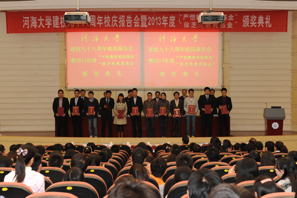 王济干副书记宣读了《关于公布2013年度“严恺教育科技基金”和”徐芝纶教育基金”有关奖项获奖人员的通知》。校领导为62名获奖者颁发了荣誉证书。