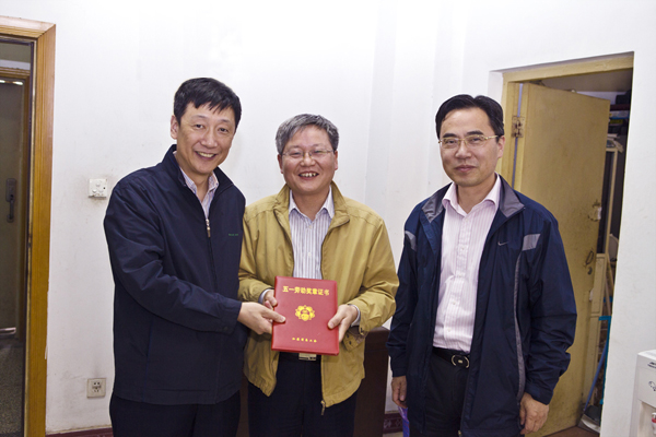 “五一”劳动节期间,校党委书记朱拓、副书记郭继超到水电院实验室看望了刚刚获得“江苏省五一劳动奖章”的顾冲时教授。 朱拓书记(左一)和郭继超副书记(左三)慰问顾冲时教授(中) 朱拓书记和郭继超副书记向顾冲时教授致以节日的问候和祝福,祝贺他在教学、科研上所取得的丰硕成果,并了解了顾冲时教授的工作情况,听取了他对学校人才培养、学科建设等方面的意见和建议,希望他再接再厉,争取更大的成绩,为学校事业发展做出新的更大贡献。(余敏)