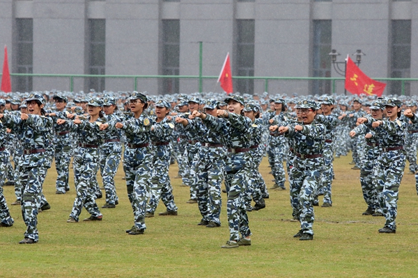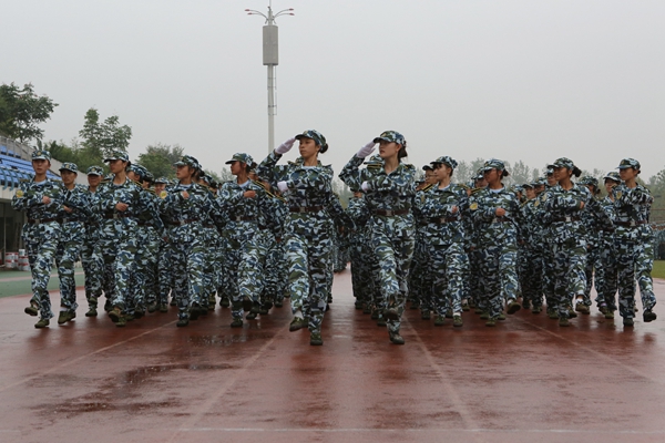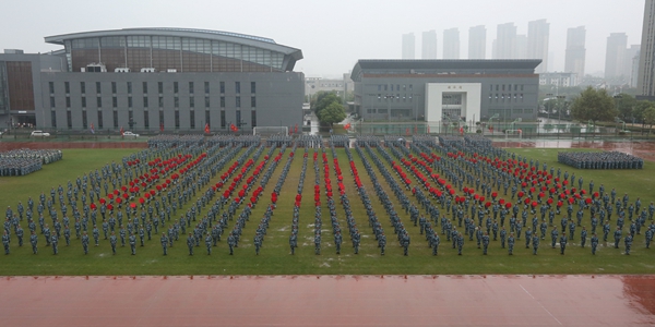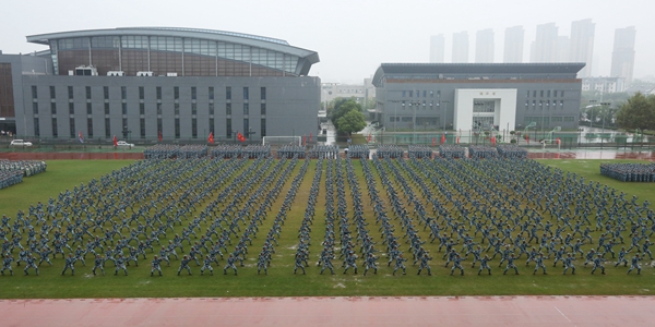 大会在庄严的国歌声中开始。校长徐辉宣布阅兵开始。在分列式中,同学们嘹亮的口号、整齐的步伐、挺拔的身姿和出色的表演赢得了阵阵热烈掌声。分列式结束后,雨越下越大,但同学们坚持在雨中进行了救护方阵展示、匕首操和女生军体拳表演。在后续的男生军体拳表演中,因担心学生身体着凉,教官发出只展示队形不打军体拳口令,但学生们集体摇手,齐喊:我们要打拳!喊声感动了在场所有人,表演在大雨中继续。响亮的口号,标准的动作,飒爽的英姿,充分体现了同学们拼搏、奋进的意志,健康、向上的精神,精彩的表现赢得了校领导、承训部队官兵和看台师生的一致好评。