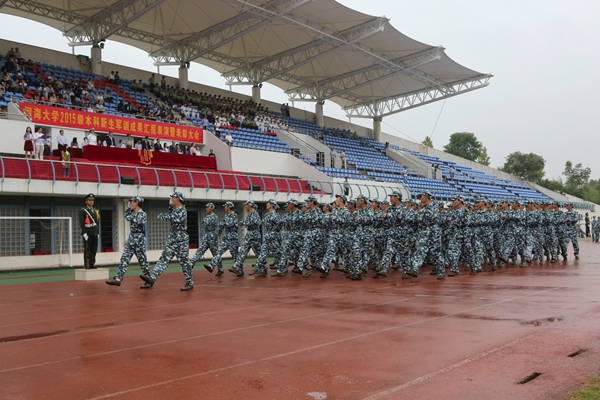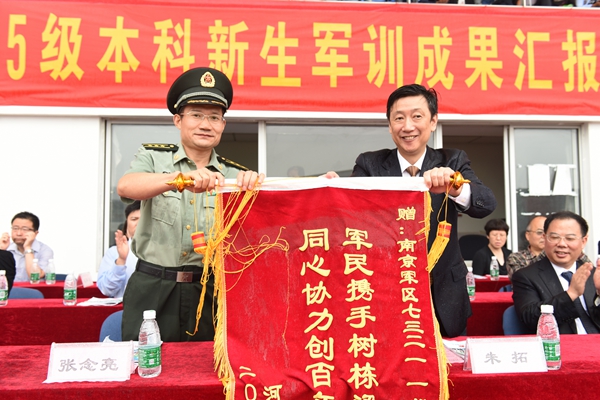 9月30日,河海大学举行2015级本科生军训成果汇报大会。校党委书记朱拓、校长徐辉、副校长鞠平、党委副书记郭继超、副校长陈星莺,海军国防生选培办主任乔光玉大校、承训部队中国人民解放军73211部队副政委张念亮出席大会。