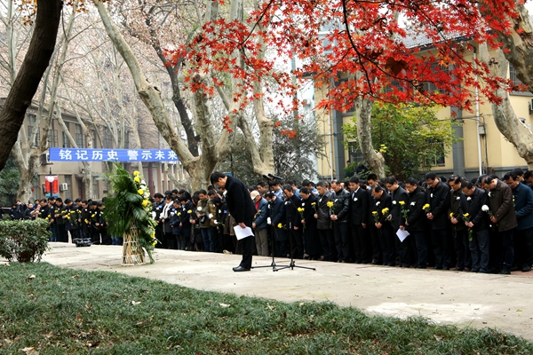 上午十时整,悼念仪式开始。在庄严肃穆的气氛中,数百名师生佩戴白花,面向纪念碑列队肃立,齐声高唱国歌,向南京大屠杀死难者默哀。默哀毕,师生代表向纪念碑敬献了花篮,师生代表、土木与交通学院副院长沈扬教授在发言中说,殷忧启圣,多难兴邦,国家公祭,民族呼声。河海人要肩负起历史赋予的使命,继往开来、永志不忘,用担当的臂膀扛起时代的重任,用知识的头脑扮靓祖国的容颜,用青春的笔触书写壮美的中国梦更大的篇章。最后,全体人员绕纪念碑一周并敬献鲜花。