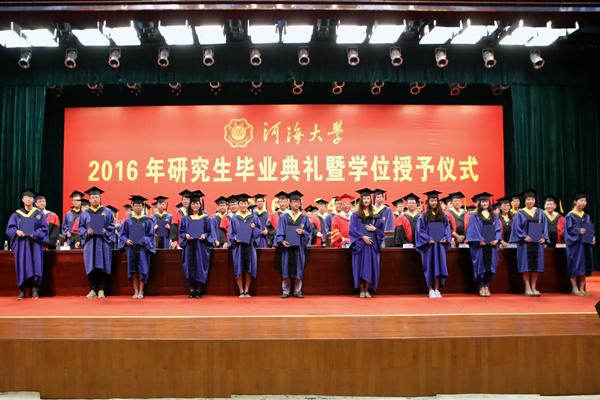 毕业典礼上,校长徐辉向典礼嘉宾郑声安校友颁发河海大学荣誉证书。副校长朱跃龙宣读了《河海大学学位评定委员会十一届六次、七次会议关于授予博士学位、硕士学位的决定》,校党委副书记郭继超宣读了《关于表彰河海大学2016届优秀毕业研究生的决定》。在庄严隆重的乐曲声中,校领导、嘉宾及研究生院、各学院领导与导师代表为获得博士、硕士学位的同学扶正流苏并颁发学位证书。毕业典礼暨学位授予仪式后,校领导、嘉宾、研究生院领导、各学院领导、导师代表与毕业研究生合影留念。