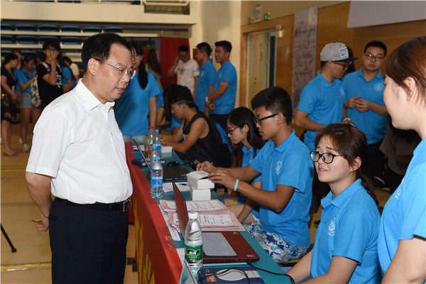 校党委书记朱拓、校长徐辉、副校长鞠平、校党委副书记郭继超、副校长陈星莺先后来到新生报到现场检查指导迎新工作。校领导详细了解了每个迎新点的迎新工作流程和进展,仔细询问了新生接待、报到注册以及后勤保障等各方面的情况,亲切慰问了各学院接待新生的工作人员和志愿者,对他们的辛勤付出给予了充分肯定,希望他们热情工作,为新生和家长提供最优质的服务,确保每一位新生及时顺利报到。校领导还与报到的新生及家长亲切交谈,了解新生及家长的实际需求,听取他们对于学校迎新工作的意见和建议。