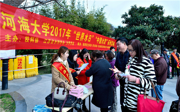 我校2017年“世界水日”“中国水周”宣传活动分为居民社区系列活动、走进幼儿园和小学系列活动、市区公园“鉴水行,宣环保”公益活动和校园系列活动四大板块,形式多样,内容丰富多彩,包括“落实绿色发展理念,全面推行河长制”主题宣传、水知识创意征集和水文化科普宣传、“世界水日”“中国水周”创意图文征集活动、“Water”主题英语角以及组织参加“水美南京”绘画、摄影作品创作等活动,营造了惜水、爱水、护水的浓厚氛围。