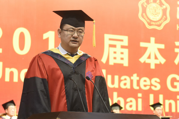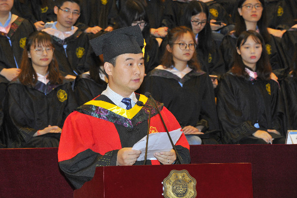 毕业典礼上,徐辉校长发表了题为《同心奋进 自我超越》的演讲,向奋力拼搏、学有所成的各位同学表示最热烈的祝贺!向悉心培育毕业生成长成才的各位老师和家长致以崇高的敬意和诚挚的问候!徐校长说,四年的时光转瞬即逝,同学们以梦为马,不负韶华,劈波斩浪,坚定前行。他以“进取心”为主题和同学们分享了所思所得,他指出,百年河海从开启中国水利高等教育之先河到20万河海人桃李芬芳遍天下,代代河海人始终以不辜负国家和社会期许为己任,志坚前行,躬身实践,在国家建设最需要的地方留下了最难忘的铿锵足迹。新时代的河海人,理应在祖国的四面八方、在国民经济的各个领域,同心奋进,自我超越,为中华民族的伟大复兴发挥更加重要的作用,让生命在不断进取中发热和闪光。徐辉校长强调,进取的路上要找准人生方向,青年人要树立起坚定正确的理想信念和目标,激发起旺盛的求知欲、强烈的好奇心和努力上进的精神动力;进取的路上要明确行动路线,从时代主题出发,同心同向谋划事业和工作;进取的路上要做到全力以赴,学会用“追求卓越”这块磨石砥砺自我;进取的路上要不断超越自我,始终保持创造性张力,以一种积极的态度对待生活,自动自发地争取最大的进步。在百年河海全面推进“双一流”建设的征程中,河海学子们也正翻开人生的崭新篇章,徐辉校长勉励毕业生们同心奋进,实现新跨越,共创新辉煌!