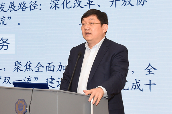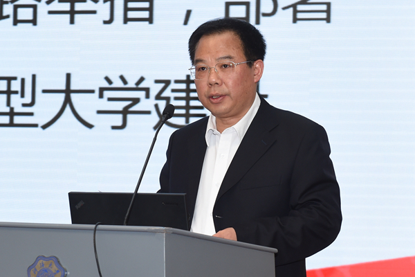 徐辉校长作题为《贯彻落实学校第十三次党代会精神,全面扎实推进世界一流特色研究型大学建设》的报告。他全面总结过去一年学校各个方面取得的成绩,客观分析了存在的突出问题与薄弱环节。他站在建设“中国特色、世界一流”大学的高度,提出要围绕内涵式发展、高质量发展的新要求,以学科为纲、育人为本、人才为魂、成果为要、资源为基,切实深化改革、开放协同、合作交流,努力实现党代会提出的九个“一流”目标任务。他从强化人才培养中心地位、构建高质量发展体系、做好学院学科建设规划、深化人事制度改革、推进国际合作与交流、谋划大平台和大项目、开展机构优化调整、加强执行力建设等八个方面对2018年目标任务进行部署。他要求全校上下要脚踏实地,担当作为,高质量完成2018年各项目标任务。