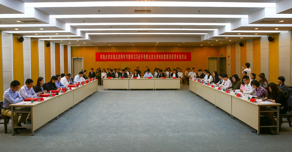座谈会上,地学院青年教授、校团委兼职副书记刘瑾,马克思主义学院副教授张静,2017年度江苏省优秀共青团干部、校团委宣传部部长、创新创业部部长朱乔,2017年度江苏好青年、外语院团委书记王璐,2017年度校优秀青年团干部、港航院团委书记朱钰,2017年度全国“五四红旗团支部”团支书、商学院14级本科生秦雅娜,2017年度全国“活力团支部”团支书、海洋院15级本科生金颖,2017年度江苏省“五四红旗团支部”团支书、计信院15级本科生刘云浩,2017年度江苏省优秀共青团员、水电院14级本科生李令,企管院15级本科生姜明栋,校学生会主席于洋,校研究生会主席江晨辉等师生代表也分享了学习习近平总书记在北京大学考察时重要讲话精神的体会,并结合自身成长经历分享了个人学习、工作和生活中的思考和感悟。