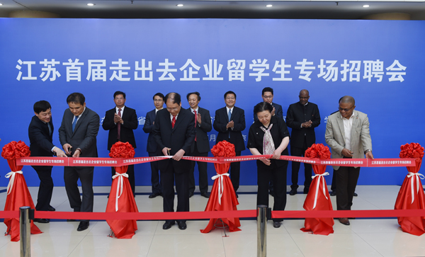 在江苏首届走出去企业留学生专场招聘会开幕式,王成斌副厅长、陈晓梅副厅长、尼日利亚驻上海总领事、哈萨克斯坦教育科学部国际人才计划中心首席代表共同为招聘会剪彩。