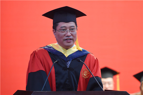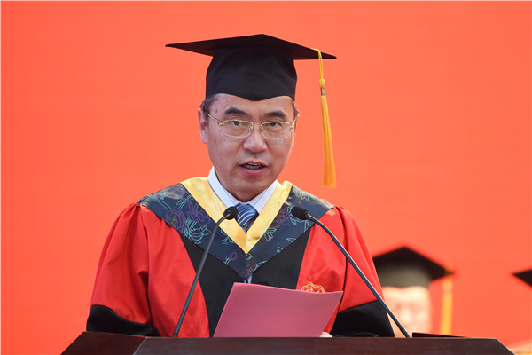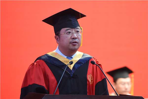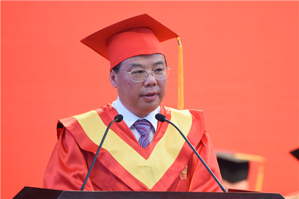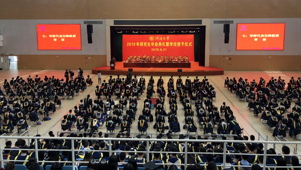 典礼上,徐辉校长发表了《勇担使命,奋斗前行》的演讲,向顺利完成学业的各位同学表示热烈的祝贺,向养育、培养其成才的父母、老师致以最诚挚的感谢。徐辉校长回顾了学校乘着新时代春风快速发展时期所取得的成就,并寄语广大毕业研究生在追逐梦想的道路上时刻牢记唯有奋斗才能不负青春,唯有奋斗才能收获成功和幸福,希望广大研究生不负时代,不负韶华,以奋斗腾飞青春梦想,以奋斗书写人生绚丽篇章。徐辉校长对广大毕业研究生提出三点希望:一要做一个有家国情怀的河海人,努力践行和弘扬“艰苦朴素、实事求是、严格要求、勇于探索”的校训精神,勇于担当、奋发作为,把个人事业牢牢扎根在中华大地上,以奋斗之我圆梦青春中国;二要做一个有理想信念的河海人,把理想信念内化于心、外化于形,做到严以修身,不断在工作中注入强大的信心,摆正心态,迸发出激情与活力,创造出更多的成果,推动自身的事业不断发展;三要做一个有创新精神的河海人,把创新的种子埋进心田,保持初心,执着坚持,勇于探究科学研究与行业发展的前沿,为中国强起来贡献自己的智慧和力量。徐辉校长表示,河海永远是毕业生最值得信赖的港湾、最坚强的后盾,衷心希望广大毕业生以兼济天下的胸怀,用美丽青春书写出自己的历史,同时祝愿各位留学生以在河海的所学所得,为全人类的水利建设事业和经济社会发展作出重要贡献。
