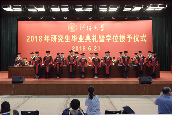 毕业典礼上,校长徐辉向典礼嘉宾陶长生校友颁发河海大学荣誉证书。副校长董增川通报了2018年研究生毕业及学位授予情况,校党委副书记郭继超宣读了《关于表彰河海大学2018届优秀毕业研究生的决定》。在庄严隆重的乐曲声中,校领导、嘉宾及研究生院、各学院领导与导师代表为获得博士、硕士学位的同学扶正流苏并颁发学位证书。毕业典礼暨学位授予仪式后,校领导、嘉宾、研究生院领导、各学院领导、导师代表与毕业研究生合影留念。
