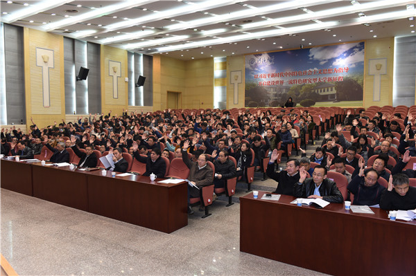徐辉校长向大会作《贯彻落实全国教育大会精神,扎实推进世界一流特色研究型大学建设》的工作报告。报告全面客观总结了学校呈现高质量发展态势的2018年工作,并谋划了2019年的工作,明确了12个方面的重点工作。徐辉校长指出,学校工作要聚焦事业发展的重点难点,全面加强党的领导,全面深化综合改革,全面提升治理能力,全面推进“双一流”建设。
