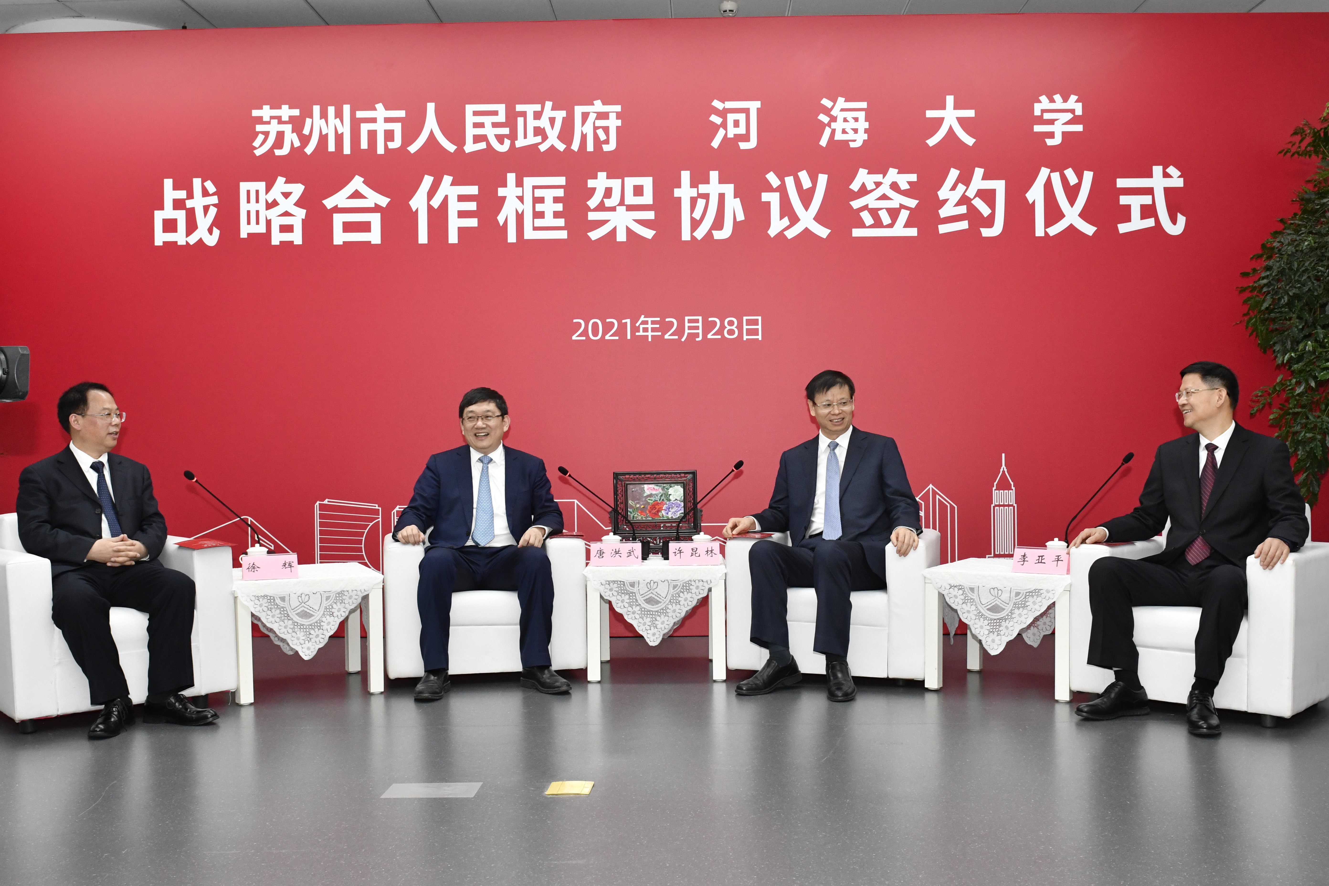 签约仪式前,江苏省委常委、苏州市委书记许昆林,苏州市委副书记、市长李亚平会见了河海大学党委书记唐洪武、校长徐辉一行。许昆林书记代表市委市政府对河海大学长期以来给予苏州经济社会发展的关心支持表示感谢。他指出,河海大学在水利等领域具有很强的实力,在科研成果转化应用上,与“水城”苏州合作空间很大,希望双方加快推进合作载体建设,引入更多优质资源,以更灵活的产学研合作机制实现优势互补、互利共赢,他表示,苏州将一如既往为高校发展提供有力保障,为创新营造优质环境。