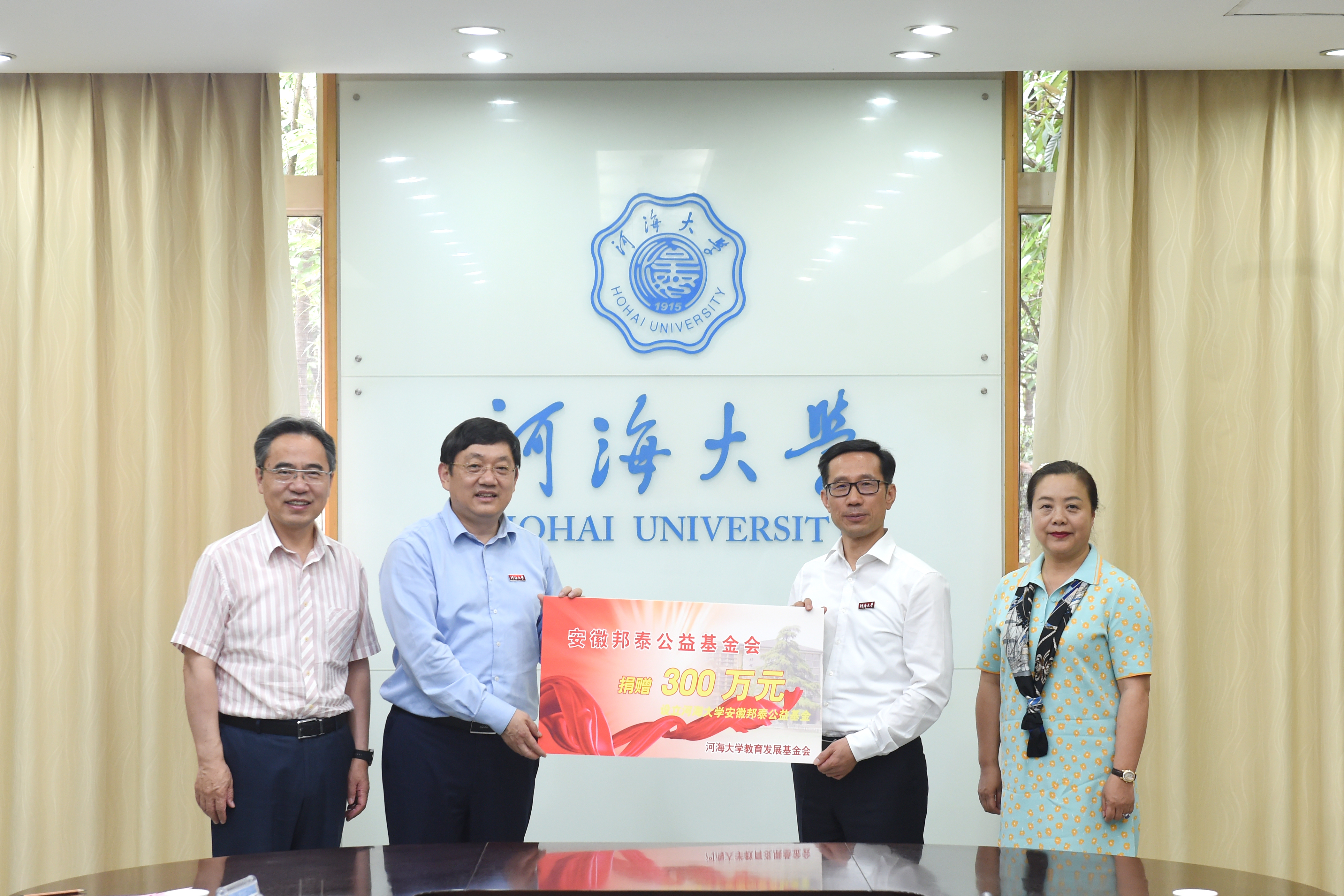 6月9日,安徽邦泰公益基金会向我校捐资300万元设立“河海大学安徽邦泰公益基金”。安徽邦泰控股集团董事长陈齐、副总裁金永春,河海大学党委书记唐洪武出席捐赠仪式。仪式由河海大学党委副书记郭继超主持。