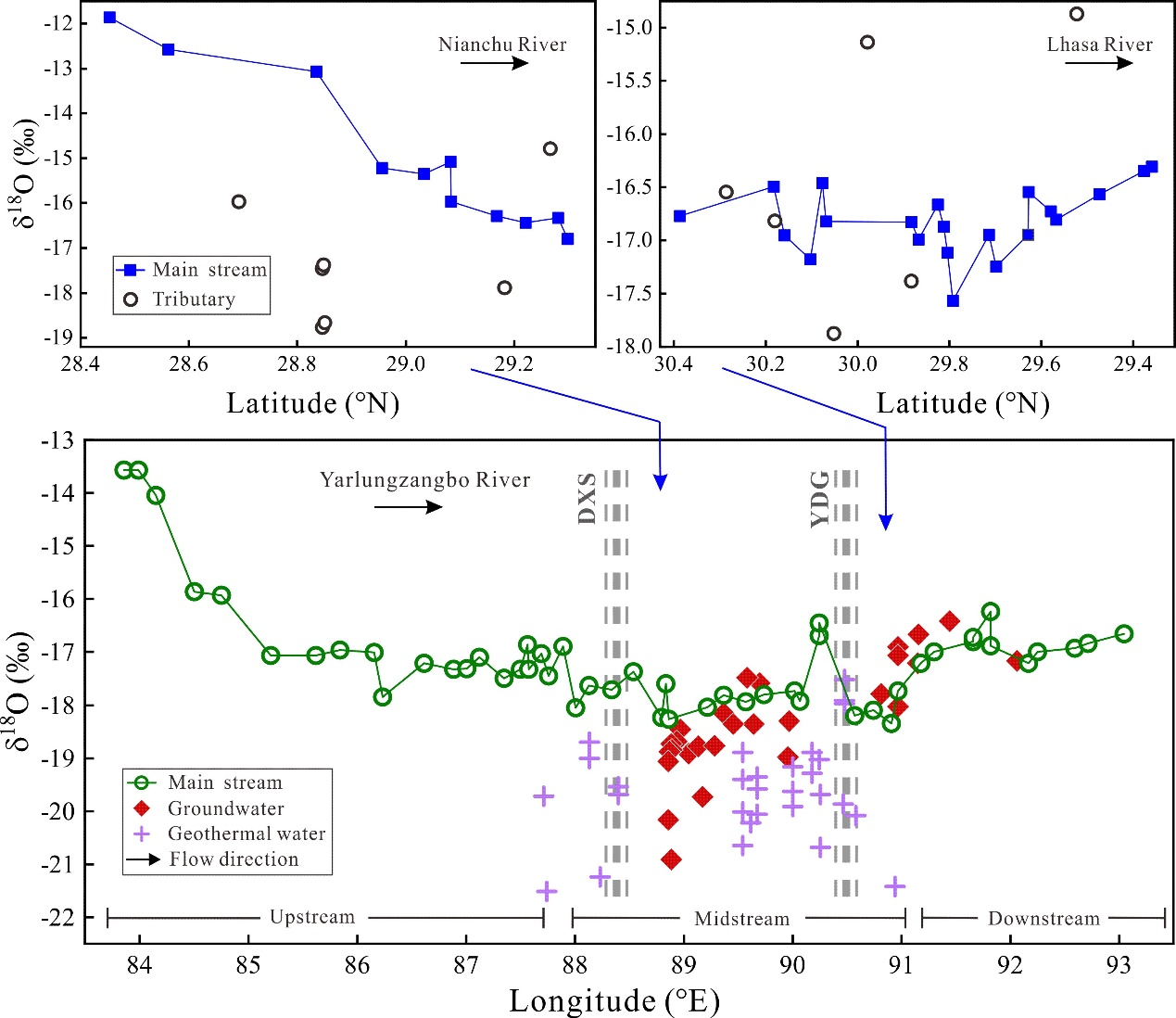 图2 雅鲁藏布江流域枯水季节O同位素空间分布规律(DXS、YDG分别为定结-谢通门-申扎与亚东-当雄-谷露南北向发育的深大断裂)