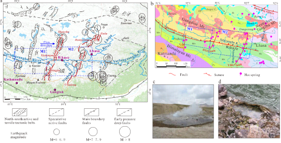 图1 垂直雅鲁藏布江发育的南北向张性深大断裂带及地下水排泄图片(左图据韩同林原图修改)