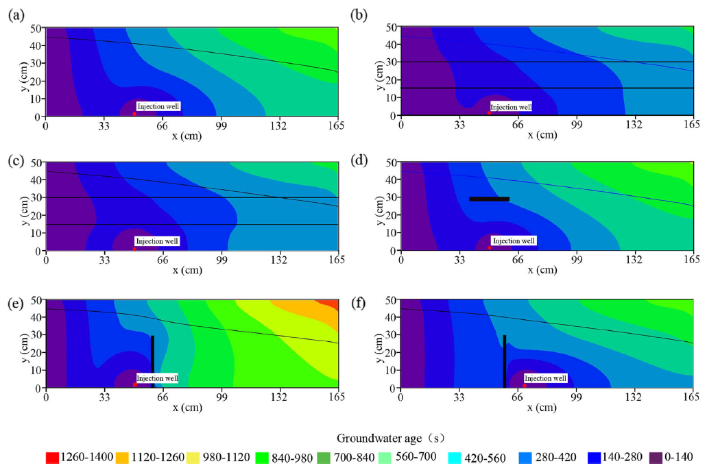 图3 不同地质构造及地层结构条件下地下水库区地下水年龄分布 (a) 均质条件;(b)、(c) 层状非均质;(d) 黏土透镜体;(e)、(f) 垂向阻水构造