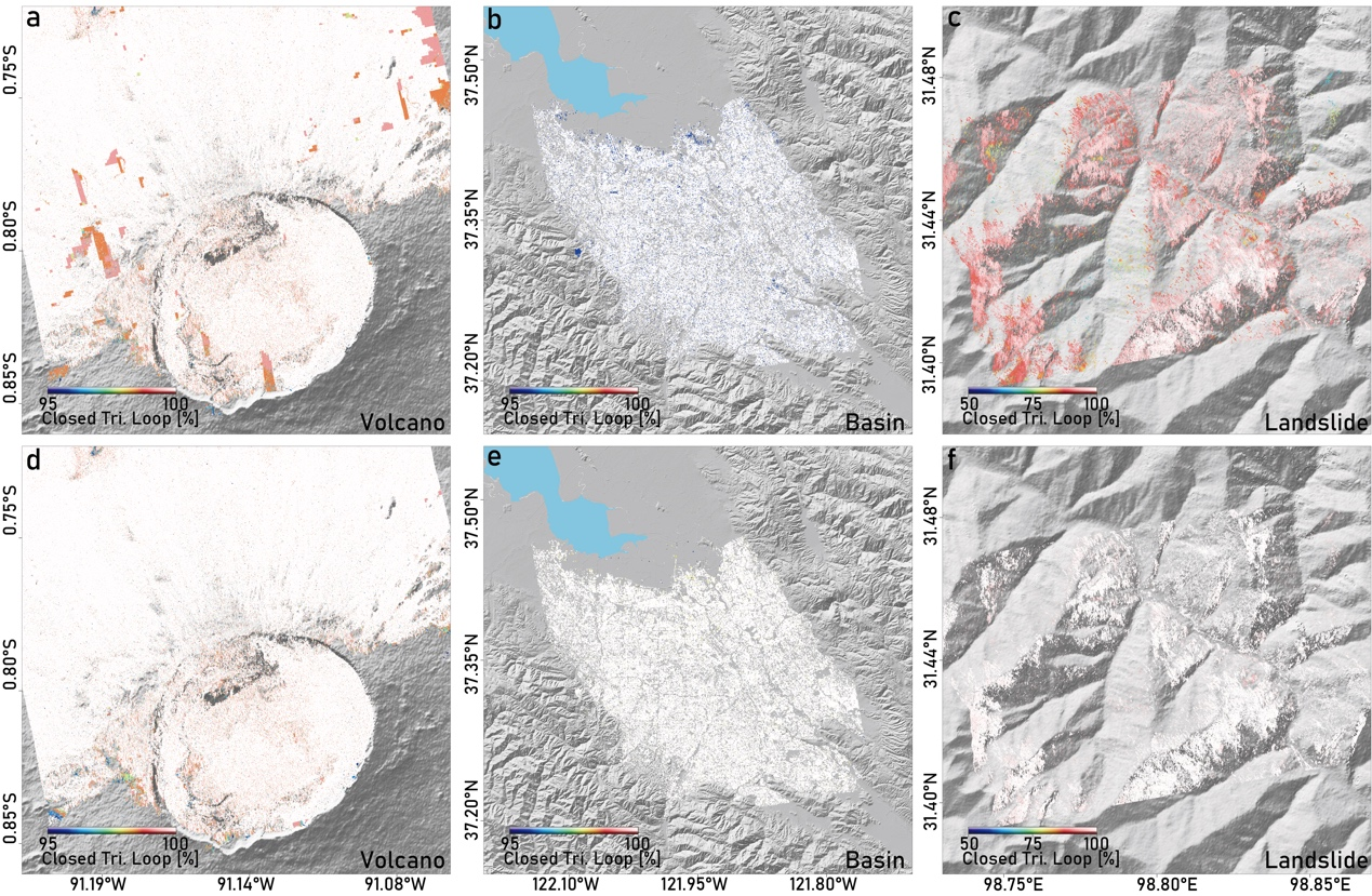 图4 新3维解缠方法精度,对比方法为著名的斯坦福StaMPS 3D方法(a-c),新方法(d-f)解缠精度在3个不同地貌例子中均优于前者
