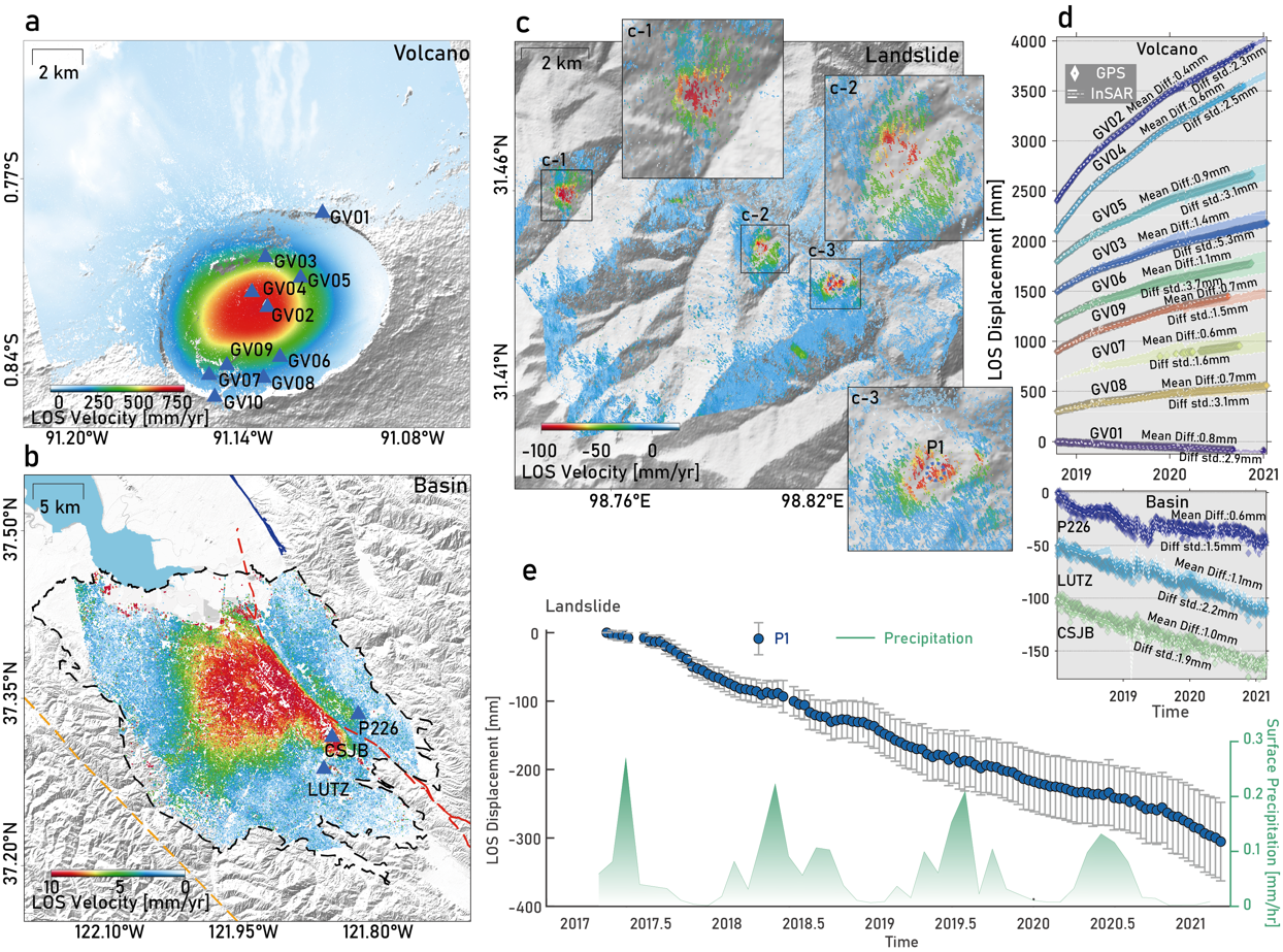 图5 毫米级长时序形变结果及与GPS对比验证,精度可靠