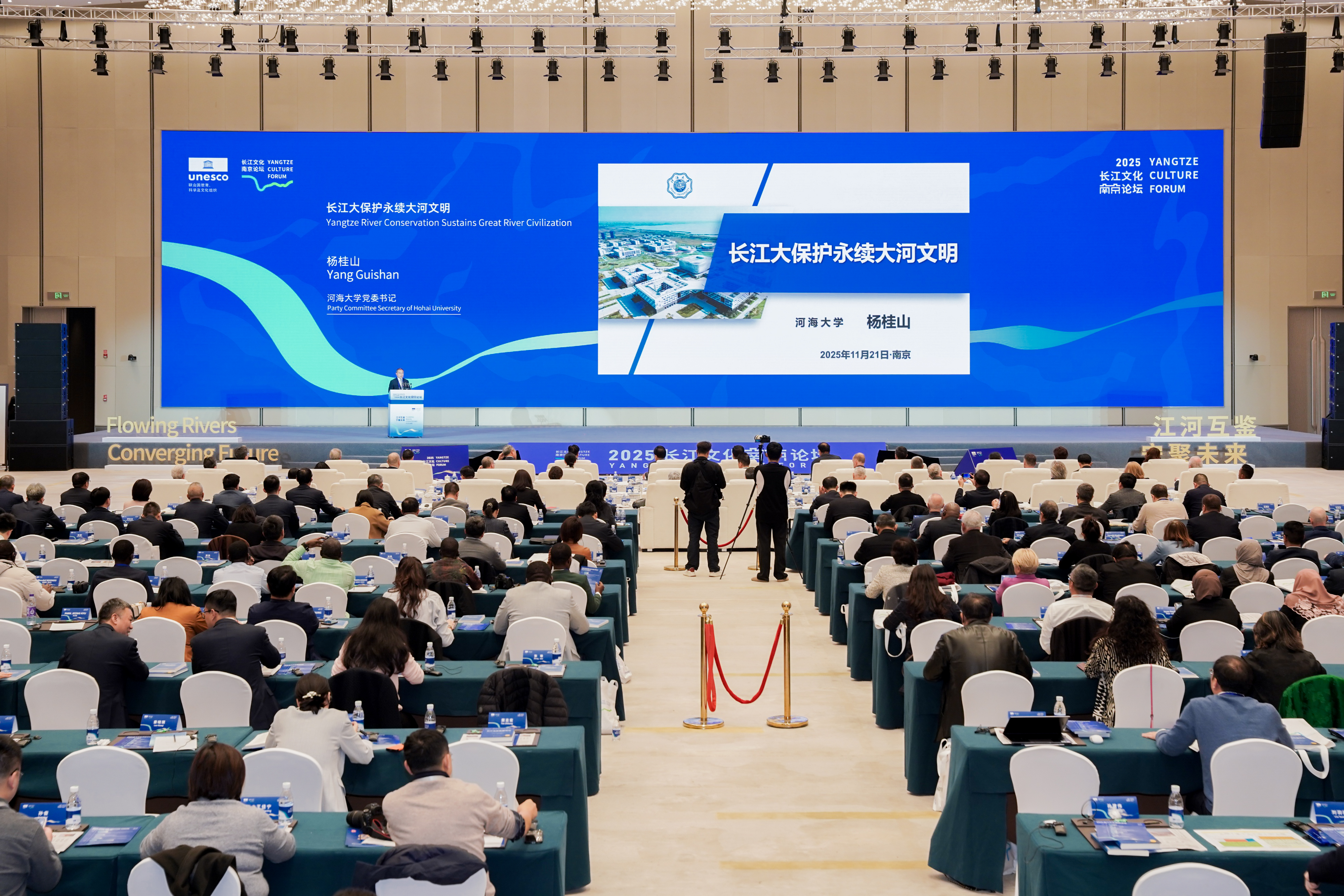 11月21日,2025长江文化南京论坛开幕。江苏省委书记信长星、新华社社长傅华、水利部副部长刘冬顺、南京市代市长李忠军出席并致辞。联合国教科文组织助理总干事利迪亚·布里托视频致辞。我校党委书记杨桂山受邀参加主论坛,并作《长江大保护永续大河文明》的主旨演讲。