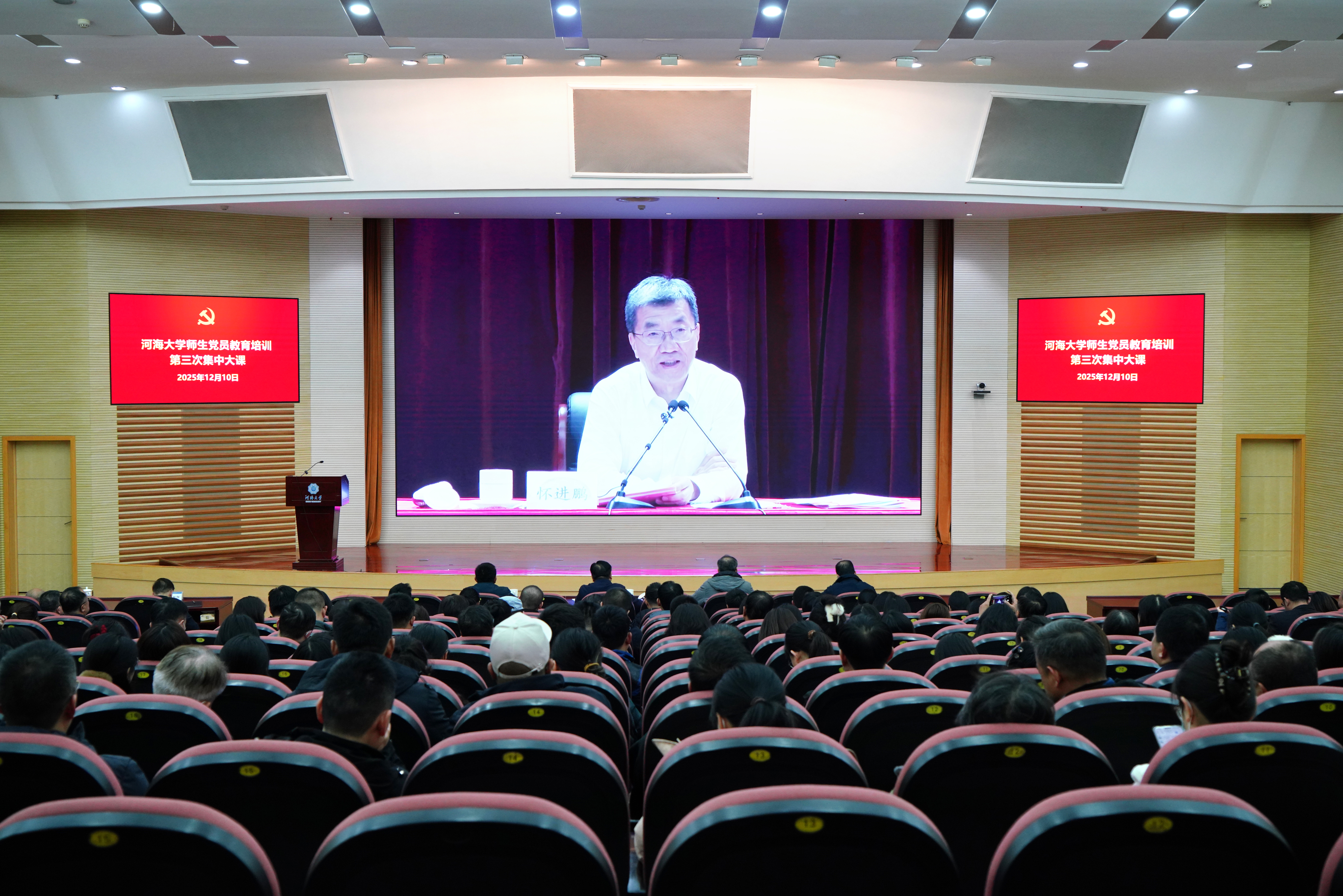 12月10日下午,河海大学举办师生党员教育培训2025年第三次集中大课。全校师生党员集中观看教育部党组书记、部长怀进鹏主讲的“深入学习贯彻习近平总书记关于教育的重要论述 以教育强国支撑引领中国式现代化”专题报告视频。全校1万余名党员分别在主会场和100余个分会场同步参加培训。校党委副书记、副校长陆国宾主持培训。