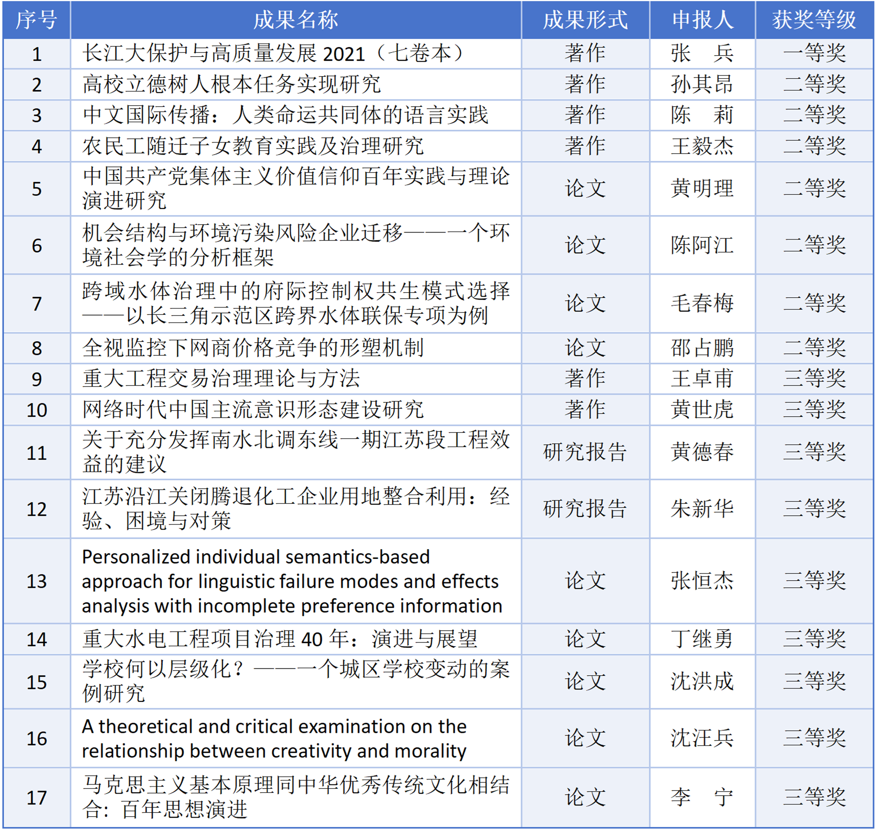 日前,江苏省人民政府发布《省政府关于公布江苏省第十八届哲学社会科学优秀成果奖的决定》,我校以第一完成单位获奖17项,其中一等奖1项、二等奖7项、三等奖9项,获奖总数创历史新高。