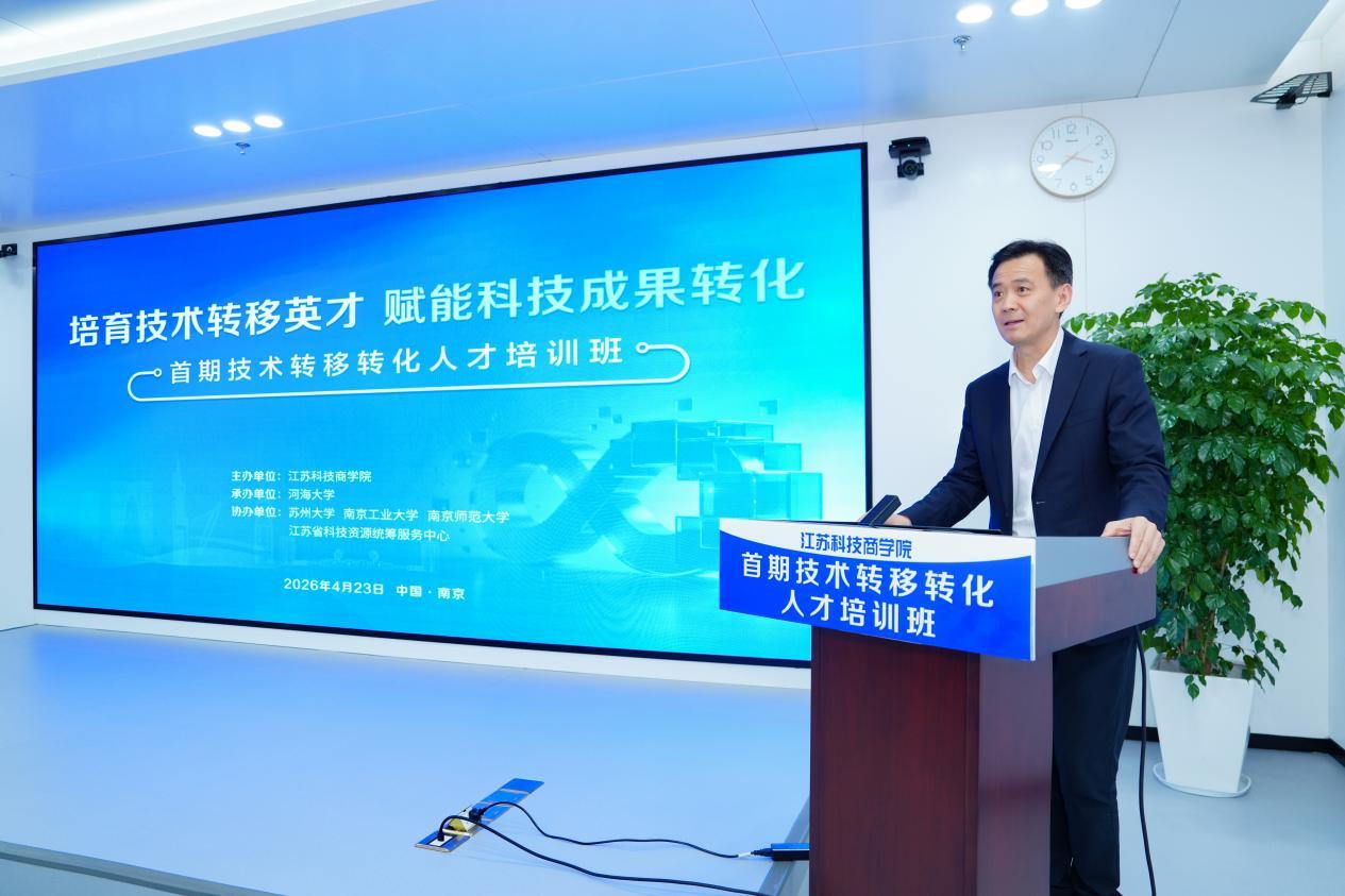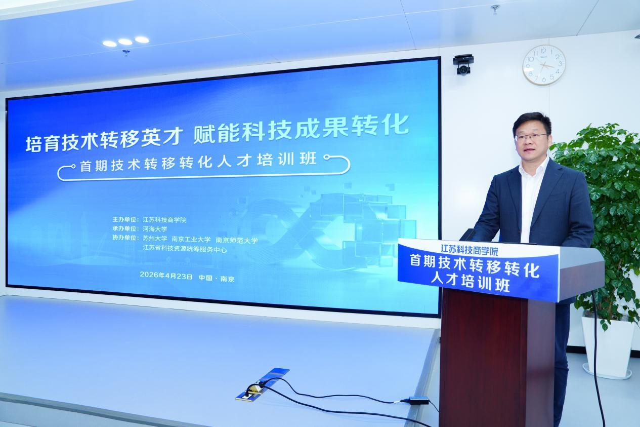 4月23日,高校区域技术转移转化中心(江苏)综合服务中心在南京江北新区正式启用。同期,江苏科技商学院首期技术转移转化人才培训班举行开班仪式。江苏省教育厅二级巡视员吴仁林、江苏省产业技术研究院院长刘庆、河海大学副校长邓成出席开班仪式。